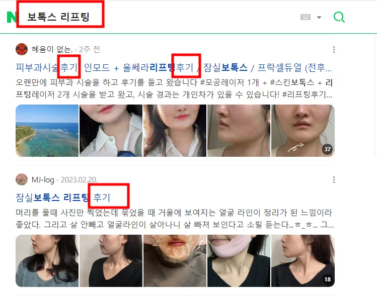 이럴 때 [보톡스 리프팅] 관련 글에는 [후기]가 포함된 제목이 상위 노출됩니다.