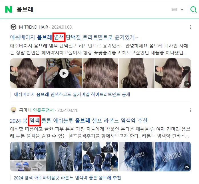 예) [옴브레] 검색결과 상위 노출 글에 [염색]이 포함되어 있습니다.
