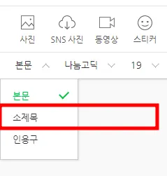 네이버 블로그 에디터에는 대제목, 중제목, 소제목 구분할 수 없으므로 [소제목]과 [인용구] [구분선]을 활용하면 됩니다.